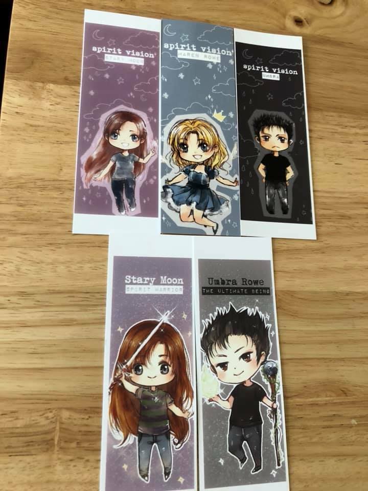 These wonderful bookmarks were made by my artist, Suzy Zhang, and are based on my main trio from my YA series, "Spirit Vision."